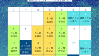 お知らせ 2025年10月のスケジュール&研究所開催日 こんにちは、星乃秋月です!遅ればせながら、10月のスケジュールを掲載いたします。(いつもホームページでのお知らせが一番遅くなってしまい申し訳ございません!よろしければInstagramの方もあわせてご覧くださいませ!)池袋・新宿の占い館の情... 2025.10.13 お知らせ出演情報