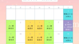 お知らせ 2025年11月のスケジュール こんにちは、星乃秋月です!今月のスケジュールをお知らせいたします。〇『星乃秋月 占い研究所 星の遊覧船』11月8日㈯ 12:00~17:00占い・霊視 10分1,500円~ご予約はコチラから〇都内の占い館にもレギュラー出演しております。占い... 2025.11.04 お知らせ出演情報